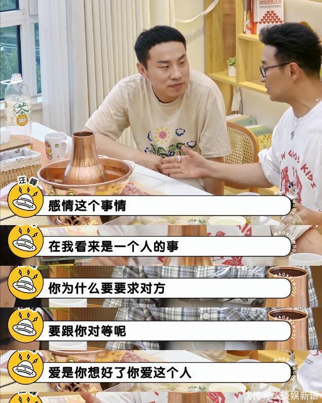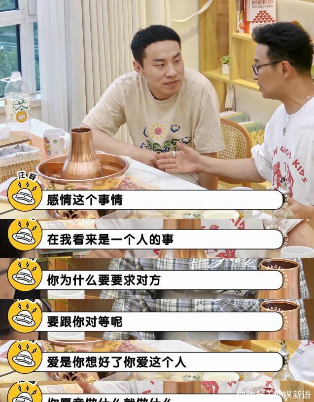 其中,在探讨对爱情的见解的时候,汪峰发表了自己的看法。 他说“感情这个事在我看来是一个人的事,为什么要要求对方跟你对等呢,并且也不要要求对方有什么回报,因为那是他的事”。